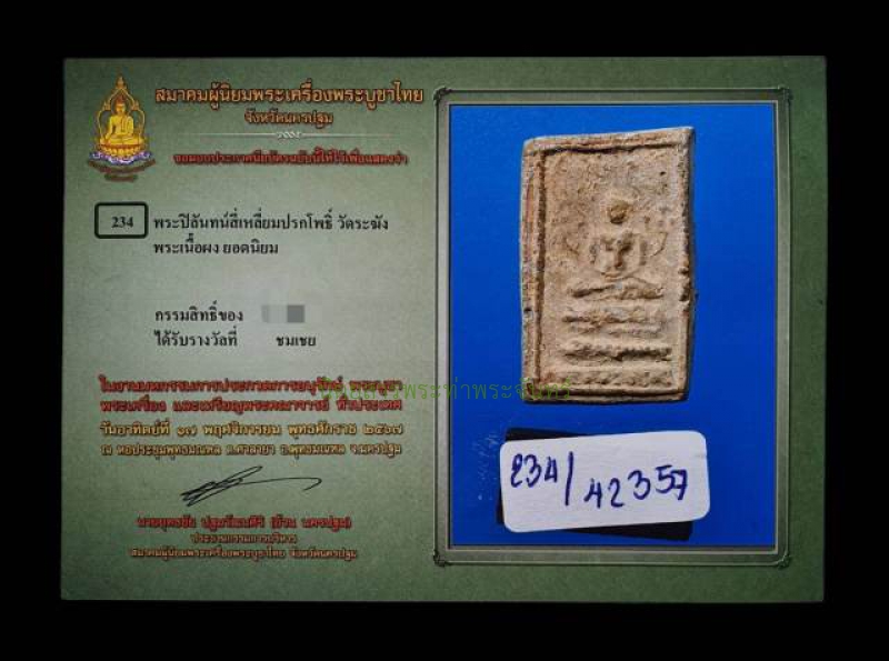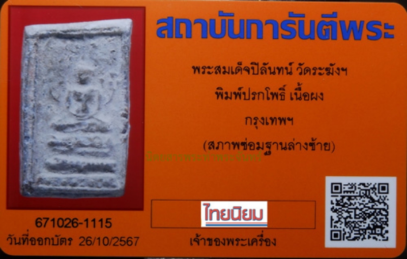 | ชื่อพระ | พระสมเด็จปิลันทน์ พิมพ์สี่เหลี่ยม ปรกโพธิ์ วัดระฆัง สวยๆ ติดรางวัลงานประกวด + บัตรรับรอง GPRA |
