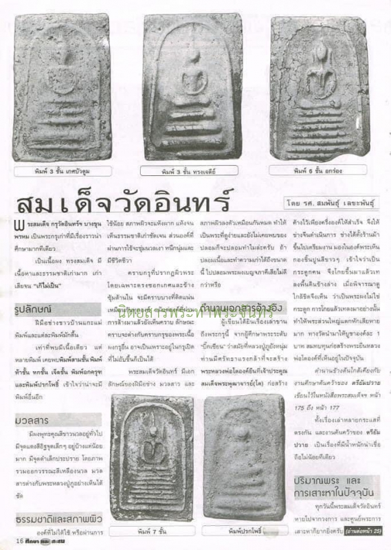 | รายละเอียดพระ | สมเด็จกรุในบาตรหลวงพ่อโต วัดอินทร กทม พระกรุวัดอินทรนี้ด้วยความมีเอกลักษณ์ที่ลงตัวชนิดที่ว่ามีเนื้อหาและธรรมชาติเก่ามาก ทำให้นักสะสมคนที่เล่นพระเก่ามานานที่ชำนาญแล้วสามารถดูได้ ไม่ว่าพิมพ์นั้นจะเคยเห็นมาก่อนหรือไม่ ก็จบกันได้ ซึ่งเข้าใจว่ายังมีอีกหลายพิมพ์ที่ยังไม่ค้นพบ พระกรุวัดอินทร์พิมพ์นี้นับเป็นพิมพ์ที่หายากพิมพ์หนึ่งของกรุนี้ เพราะพบเจอน้อย ส่วนมากที่เห็นก็จะอยู่โซนวัดเกศไชโยหรือแก่มวลสารกว่านิดหน่อย เป็นสกลุช่างชุดเดียวกับสมเด็จวัดระฆังและบางขุนพรหมชัดเจน ในส่วนเนื้อพระ มีร่องรอยธรรมชาติ รอยยุบ รอยย่น รอยรูพรุนปลายเข็ม รอยปริ รอยแยก รอยบ่อน้ำตา ให้เห็นเช่นเดียวกับพระสมเด็จระฆัง พระแบบนี้เรียกว่า"พระดูง่าย"เพราะมีธรรมชาติครบสูตร อย่างที่เข้าใจกันตามประวัติหนังสือตรียัมปวาย บันทึกไว้ว่า พระครูสังฆบวร ท่านได้มาสำรวจหลวงพ่อโตวัดอินทร์ และทำการบูรณะ ได้ให้ช่างจีนที่ขึ้นไปทำการบูรณะหลวงพ่อโต ช่างจีนที่ขึ้นไปเทปูน บอกว่ามีกระดูกผีอยู่ในองค์พระ ท่านพระครูฯจึงให้โกยลงมา เมื่อนำมาดูปรากฏว่าเป็นพระสมเด็จทั้งสิ้น ผลจากการโกยลงมาทำให้พระแตกหักชำรุดเสียหายซะส่วนใหญ่ เป็นพิมพ์ 3 ชั้น, พิมพ์ 5 ชั้น, 6 ชั้น, 7 ชั้น, 9 ชั้น, ที่หลวงเจียรนัยติว่าไม่งาม เจ้าพระคุณสมเด็จฯโตจึงเอาไป บรรจุที่วัดไชโย อ่างทอง และบนองค์หลวงพ่อโต วัดอินทรวิหาร ส่วนพระแตกที่เสียหาย พระครูสังฆ์ได้ตำบดผสม กดพิมพ์ใหม่แจกจ่ายคนทีมาทำบุญที่วัดอินทรวิหารเรียกว่า"สมเด็จพระครูสังฆ์". สำหรับท่านใดที่ได้บูชาพระกรุวัดอินทร์นี้ ถ้าได้สภาพสมบูรณ์ไม่หักบิ่น ถือว่าโชคดีมากครับ CR. จรณ์ บางขุนพรหม (แม๊ค นะโมพุทธายะ) “ เมื่อใจมีศรัทธา ปาฏิหาริย์จะเกิดขึ้นเสมอ “ |