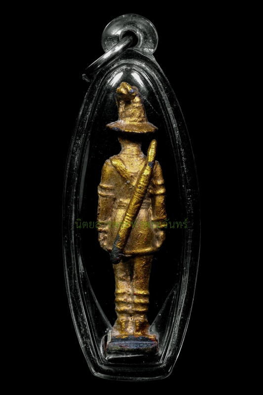 A standing statue of King Taksin, Taksin Camp, Chanthaburi Province, 2531 BE (1988 AD). Made of lead with vermilion coating and gold leaf. The statue is encased in a clear, waterproof frame, ready for worship. The original surface is beautiful and shows signs of age. A code is stamped on the base. The casting is complete and undamaged The history of the creation of the sacred amulets: the replica cast statue of King Taksin the Great and the King Taksin banner amulet, 1988. They were created at Taksin Camp, Chanthaburi, by Captain Phisai Panjai (his rank at the time). This is another series of replica cast statues that underwent a very auspicious consecration ceremony Various revered monks from all regions of Thailand contributed gold plates inscribed with sacred characters and symbols, numbering no less than 70, to the ceremony. Many other renowned monks also participated in the consecration ceremony at Taksin Camp on Saturday, October 29, 1988 Many more, some of whom are listed below: