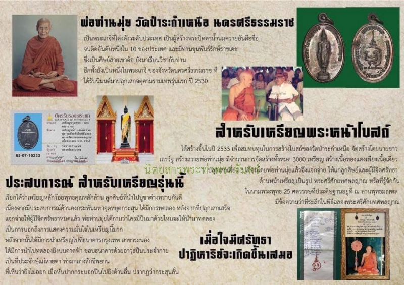 | รายละเอียดพระ | #เหรียญหน้าโบสถ์พ่อท่านมุ่ย (บล็อคนิยม) วัดป่าระกำเหนือ นครศรีธรรมราช บทความจากทั้ง 3 ท่าน บทความจากคุณสุคะโต ท่าพระจันทร์ วัตถุมงคลที่ท่านเสกจริงๆ ท่านเสกเป็นเดือนเป็นไตรมาส ไม่ครบตามที่ท่านเสก ท่านว่าใช้ไม่ได้ ที่ของอื่นให้ท่านพนมมือ ให้จับลังจับกล่อง แล้วถ่ายรูปไปลงสื่อ ต้องคิดเอาเอง ขนาด ตอนสร้างเหรียญหน้าโบสถ์ เพื่อหาเงินมาหล่อพระประธานปางลีลา ที่จะประดิษฐานไว้หน้าโบสถ์ ท่านยังพูดว่า " เขาจะหาว่ากูสร้างพระหากิน " ต้องพูดอธิบายอยู่หลายครั้งจนท่านยอม เพราะวัดไม่มีเงินจะสร้างได้ ท่านยังพูดกำชับอีกว่า " มึงอย่าสร้างมากนักแรง " "จะให้ทำบุญเท่าไหร่ " ท่านกลัวชาวบ้าน ยากจน คนแถววัด ชาวนา ชาวสวน จะไม่มีโอกาสร่วมบุญ สุดท้าย ใครทำบุญ 10 บาท จะได้รับ 1 เหรียญ เรื่องราวก็ผ่านมา 30 ปีแล้ว จำได้บ้างไม่ได้บ้างอาจคลาดเคลื่อนบ้าง แต่สาระสำคัญนั้นถูกต้องแน่นอน เพราะผู้สร้างเล่าให้ฟังมา นับครั้งไม่ถ้วน อีกทั้งทันพ่อท่าน ได้ไปกราบ ไปช่วยถ่ายรูปให้ท่าน หลายคราว ยังจำได้ ครั้งแรกที่พยุงท่านลงจากชานพักในกุฏิ ที่ท่านนั่งรับแขกเป็นประจำ ทีแรกเห็นท่านผอมมาก คิดว่าตัวท่านคงเบา เลยไม่ทันออกแรง ปรากฏว่าตัวท่านหนักกว่าที่คิด ท่านรู้สึกไม่มั่นคง ท่านเลยพูดว่า " มึงจับชับชับ" เป็นอันเข้าใจ พยุงท่านไปนั่ง จัดฉาก แล้วถ่ายรูป เสร็จก็ฟังท่านสนทนากับ ผู้ใหญ่และกับผู้คนที่มากราบท่าน โดยปกติ ท่านไม่รับนิมนต์ ไปนอกวัด ผู้ใหญ่ท่านเลยถามว่าเหตุใดพ่อท่านไม่ค่อยรับนิมนต์ไปนอกวัด ท่านตอบว่า " คนเขามาหากู ไม่เจอ เขาเสียเวลาเสียศรัทธา " ท่านเป็นพระที่ละเอียดถี่ถ้วน วาระจิตว่องไว สมถะ เรียบร้อย จะพูดจะจามีสติตลอดเวลา ไม่พูดจาเรื่อยเปื่อย ไม่ว่าใคร ที่เคยได้รับรู้มา ก็มีแค่ ท่านถามว่า " ทำไมทำอย่างนั้น " แล้วท่านก็ไม่พูดอะไรอีก ทั้งที่ผู้นั้นแอบอ้างเอาท่านไปหากิน โดยมากท่านก็เฉยเสีย กับเรื่องไม่ดี ทุกข์ร้อนมาท่านก็ช่วยตามความรู้ ไม่รู้ท่านก็บอกไม่รู้ ไม่แน่ใจท่านก็เฉยเสีย พระอย่างท่านศีลดี ศีลครบแน่นอน กราบได้สบายใจ หาแบบท่านไม่ใช่ง่ายแล้ว บทความจากพระมหาศิริเทพ เทพศิรินทร์ พ่อท่านปลุกเสกนานมากๆ พ่อท่านให้สร้างพระไว้หน้าโบสถ์ ว่าแม้โบสถ์ปิดชาวบ้านก็ได้กราบไหว้ได้ตลอด ในกาลนั้นได้ทำเหรียญวาระเพื่อฉลองพระหน้าโบสถ์ เหรียญจะเสร็จก่อน พ่อท่านนำไปเสกในกุฏิห้องที่จำวัด เวลาผ่านไป โยมพ่อขาวไปกราบท่าน ก็ถามว่าเสกเหรียญเสร็จหรือยัง พ่อท่านมุ่ยบอกว่ายับกราบเสร็จก็กลับระนอง ... ต่อมา ก็ไปกราบท่านอีก ท่