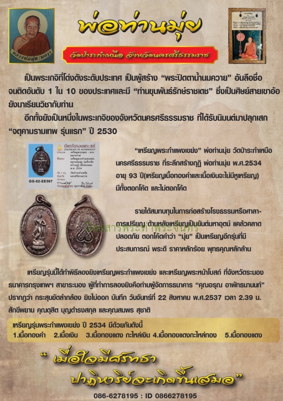 | ชื่อพระ | เหรียญกำแพงเขย่งพ่อท่านมุ่ย |