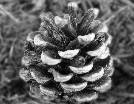 A cone (in formal botanical usage: strobilus, plural strobili) is an organ on plants in the division Pinophyta (conifers) that contains the reproductive structures. The familiar woody cone is the female cone, which produces seeds. The male cones, which produce pollen, are usually herbaceous and much less conspicuous even at full maturity. The name "cone" derives from the fact that the shape in some species resembles a geometric cone. The individual plates of a cone are known as scales.