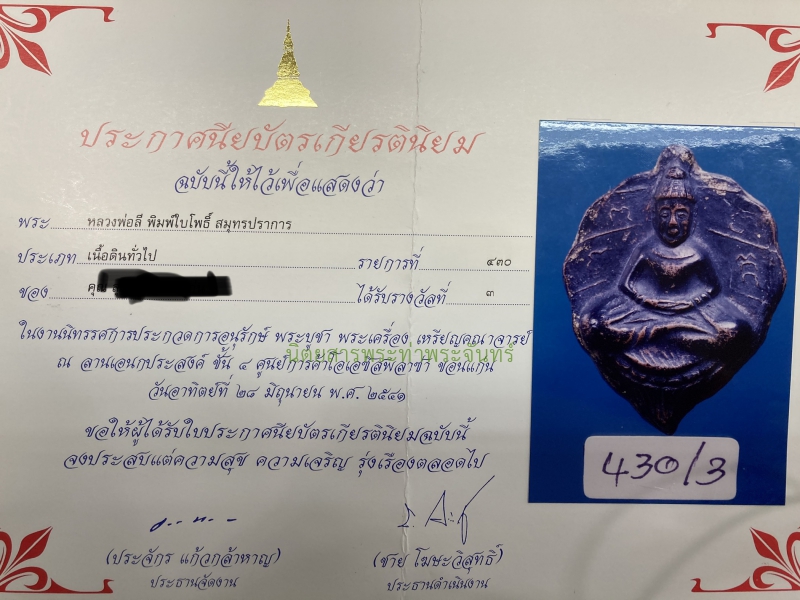 | รายละเอียดพระ | พระโพธิจักรพิมพ์ใบโพธิ์ เนื้อดินเผา ท่านพ่อลี (หลวงพ่อลี) แจกกรรมการ ขอบทอง วัดอโศการาม จ.สมุทรปราการ ปี2500 ประวัติพระพิมพ์ใบโพธิ์ท่านพ่อลี พระพิมพ์ที่ทำแบบใบโพธินี้เรียกว่าพระโพธิจักร ทำเป็นพระพุทธรูปปางแสดงพระธรรมจักรประดิษฐ์อยู่ในใบโพธิ ต่อมาเนื่องจากเหตุบางประการ ท่านจึงทำเป็นพระพุทธรูปปางสมาธิ ประดิษฐานอยู่ในใบโพธิทำนองเดียวกัน เหตุที่เปลี่ยนมาเป็นพระปางสมาธินั้น ท่านกล่าวไว้ในประวัติของท่านว่า วันหนึ่งเกิดนิมิตแปลกประหลาด คืนวันหนึ่งเงียบสงัดกำลังนั่งพิมพ์พระพุทธรูปอยู่ มีพระบรมธาตุองค์หนึ่งได้เสด็จมาปาฏิหารย์มาอยู่บนเตียงนอน มีลักษณะคล้ายรูปพระใบโพธิที่กำลังพิมพ์อยู่ แต่พระใบโพธิ์ที่พิมพ์อยู่เป็นแบบพระแสดงธรรมจักร คือยกพระหัตถ์ ๒ ข้างเป็นแบบแสดงพระธรรมเทศนา จึงได้ตั้งชื่อพระพิมพ์นี้ว่า พระโพธิจักร ครับ ท่านพ่อลี ธัมมธโร วัดอโศการาม ท่านเป็นศิษย์อาวุโสรุ่นแรกๆของท่านพระอาจารย์มั่น ภูริทัตโต แห่งกองทัพธรรม สรีระสังขารของท่านไม่เน่าเปื่อย เก็บรักษาในโลงทอง บนวิหาร แห่งวัดอโศการาม จ.สมุทรปราการ มีผู้กล่าวกันว่าอดีตชาติของท่านเคยเป็นพระเจ้าอโศกมหาราช รุ่นนี้สร้างจากผงมวลสารล้วนๆ ที่สำคัญๆ มากมาย...เช่น ผงเกสรดอกไม้ 108 ผงธูปอธิษฐาน ผงพระธาตุ ผงว่าน ผงพุทธคุณต่างๆ มากมาย สร้างในปี พ.ศ.๒๕๐๐ พิธีใหญ่ฉลอง ๒๕ ศตวรรษของทางสายวัดป่าฯ จัดขึ้นที่วัดอโศกราม จ.สมุทรปราการ เป็นพิธีใหญ่ที่รวบรวมสายกรรมฐานของท่านอาจารย์ใหญ่มั่น มาชุมนุมกันมากมาย ถ้าใครเคยไปวัดอโศการามจะเห็นเป็นภาพวาดบนฝาผนังโบสถ์ในงานนี้ ดังรายนามต่อไปนี้ 1.พระอาจารย์สิงห์ ขันตยาโม วัดป่าสาละวัน จ.นครราชสีมา 2.หลวงพ่อลี วัดอโศการาม จ.สมุทรปราการ 3.หลวงปู่ฝั้น อาจาโร วัดถ้ำขาม จ.สกลนคร 4.หลวงปู่ตื้อ อจลธมฺโม วัดอรัญญวิเวก บ้านข่า จ.นครพนม 5.หลวงปู่ชอบ ฐานสโม วัดป่าสัมมานุสรณ์ วังสพุง จ.เลย 6.หลวงปู่เทสก์ เทสรังสี วัดหินหมากเป้ง จ.หนองคาย 7.หลวงปู่สาม อกิญจโน วัดป่าไตรวิเวก จ.สุรินทร์ 8.หลวงตามหาบัว วัดบ้านตาด จ.อุดรธานี 9.หลวงปู่หลุย วัดถ้ำผาบิ้ง 10.หลวงปู่สิม วัดถ้ำผาปล่อง 11.หลวงปู่หลอด วัดใหม่เสนา 12.ท่านพ่อเฟื่อง วัดธรรมสถิต 13.หลวงปู่เจี๊ยะ วัดภูริทัตฯ 14. หลวงปู่ฝั้น วัดป่าอุดมสมพร 15. หลวงปู่ขาว วัดถ้ำกลองเพล 16. หลวงปู่เทศก์ วัดหินหมากเป้ง 17. เจ้าคุณแดง วัดป่าประชานิยม 18. หลวงปู่ดูลย์ วัดบูรพาราม 19. หลวงปู่อ่อน ญานสิริ 20. หลวงปู่แว่น วัดถ้ำพระสบาย 21. พระอาจารย์จวน แห่งภูทอก ฯลฯ ทั้งหมดนี้เป็นศิษย์พระอาจารย์มั่น ภูริทัตต