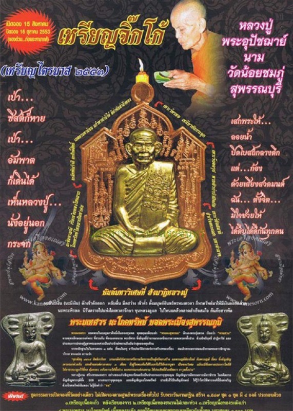| รายละเอียดพระ | เหรียญจิ๊กโก๋ หลวงปู่นาม วัดน้อยชมภู่ จ.สุพรรณบุรี ปี 2553 หลังยันต์นารายณ์ผลิกแผ่นดิน เหรียญรุ่นนี้จัดเป็นเหรียญยอดนิยมอันดับต้นๆ ของหลวงปู่นาม เหรียญนี้เนื้อเงิน สร้าง 588 เหรียญ ทุกเหรียญตอกโค๊ตรันหมายเลขกำกับเหรียญนี้หมายเลข 124 พระสวยมากพร้อมกล่องเดิมครับ จำนวนการสร้างเหรียญจิ๊กโก๋ ลป.นาม 1.เนื้อเงินหน้าทองคำ 188 เหรียญ 2 เนื้อเงินแท้ 588 เหรียญ 3.เนื้อนวะโลหะ หน้าเงิน 588 เหรียญ 4.เนื้อนวะโลหะ 1888 เหรียญ 5.เนื้ออัลปาก้า 1888 เหรียญ 6.เนื้อทองแดง 3188 เหรียญ 7.เนื้อทองเหลือง 3188 เหรียญ 8.เนื้อตะกั่ว หน้าฝาบาตร 2553 เหรียญ 9.เนื้อตะกั่ว หน้าชนวน 2553 เหรียญ |