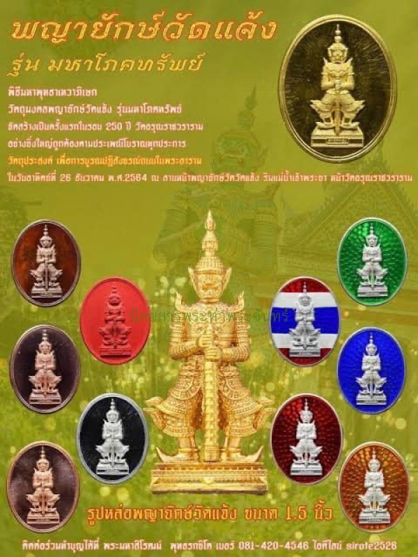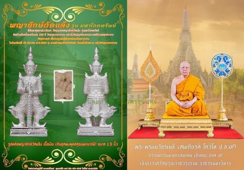 | รายละเอียดพระ | "พญายักษ์วัดแจ้ง รุ่นมหาโภคทรัพย์" ครั้งแรกในรอบ 250 ปี พญายักษ์วัดแจ้ง ต้นตำนานท้าวเวสสุวรรณแห่งลุ่มแม่น้ำเจ้าพระยา เจ้าแห่งยักษ์ผู้ควบคุมภูตผีปีศาจ ที่มีตำนานเล่าขานถึงความศักดิ์สิทธิ์มานานกว่า 200 ปี หากจะกล่าวถึงตำนานการสร้างรูปปั้นพญายักษ์อันศักดิ์สิทธิ์ หรือจะกล่าวถึงตำนานการสร้างรูปเหมือนของท่านท้าวเวสสุวรรณ เจ้าแห่งยักษ์ทั้งปวงผู้ควบคุมภูตผีปีศาลทั้งหลาย ที่มีตำนานเล่าขานถึงความศักดิ์สิทธิ์มานานกว่า 200 ปี คงต้องยกให้พญายักษ์วัดแจ้ง รูปปั้นพญายักษ์ยืนแห่งวัดอรุณราชวราราม เป็นที่หนึ่งแห่งตำนานการสร้างรูปเหมือนพญายักษ์ทั้งหลายทั้งปวงในเมืองไทย เพราะรูปปั้นพญายักษ์แห่งวัดอรุณราชวรารามคู่นี้ เป็นรูปปั้นพญายักษ์ยืนคู่แรกของเมืองไทย สร้างขึ้นตามพระราชดําริของ พระบาทสมเด็จพระนั่งเกล้าเจ้าอยู่หัว รัชกาลที่ 3 โดยทรงโปรดให้ หลวงเทพกัน ช่างปั้นฝีมือดีแห่งกรุงรัตนโกสินทร์ในยุคนั้นเป็นผู้ปั้น โดยปั้นออกมาเป็นพญายักษ์คู่ตามศิลปะไทยโบราณ มีลักษณะสง่าน่าเกรงขาม งดงามวิจิตรตระการตา ดั่งพญายักษ์คู่นี้มีชีวิตจริง ต่อมาในสมัยของพระเดชพระคุณ พระพิมลธรรม(นาค สุมนนาโค) อดีตเจ้าอาวาสวัดอรุณราชวราราม รูปที่ 10 สุดยอดพระเกจิอาจารย์ผู้เรืองวิทยาคม ผู้เป็นต้นตำหรับการสร้างตะกรุดหนังหน้าผากเสือวัดอรุณอันโด่งดัง ตะกรุดหนังหน้าผากเสือของท่าน เป็นที่เสาะแสวงหาต้องการมีไว้บูชาของผู้เคารพศรัทธาในองค์หลวงปู่นาคเป็นอย่างยิ่ง ตั้งแต่ครั้งอดีตจนถึงยุคปัจจุบัน เมื่อวันที่ 24 สิงหาคม พุทธศักราช 2473 ได้เกิดฝนตกหนัก มีอสุนีบาตตกถูกพญายักษ์หน้าพระอุโบสถด้านทิศเหนือพังลงมา พระเดชพระคุณหลวงปู่นาค ท่านจึงได้บอกบุญเรี่ยไรแก่พี่น้องประชาชนในย่านนั้น ร่วมกันสร้างขึ้นใหม่ แล้วทำพิธีสมโภชเบิกเนตรเพิ่มพลังให้แก่พญายักษ์ทั้งสองตนนี้ ให้เป็นพญาแห่งยักษ์ที่มีความศักดิ์สิทธิ์ มีความสวยสง่างามดั่งที่เห็นกันอยู่ในปัจจุบัน ยักษ์วัดแจ้ง พญายักษ์คู่แห่งวัดอรุณลุ่มแม่น้ำเจ้าพระยาคู่นี้ คือพญายักษ์ที่อยู่เหนือยักษ์ตนใดๆ เป็นพญายักษ์ที่มากด้วยความภาคภูมิใจของพวกเราเหล่าพี่น้องประชาชนชาวไทย เพราะเป็นพญายักษ์ที่จัดสร้างขึ้นตามพระราชดําริขององค์พระมหากษัตริย์ไทย มีความศักดิ์สิทธิ์ มากด้วยตบะบารมี เป็นพญายักษ์คู่โบราณที่มีความศักดิ์สิทธิ์แล้วตั้งแต่เริ่มสร้าง และยังได้ผ่านการทำพิธีเบิกเนตรสมโภชถูกต้องตามประเพณีโบราณ ได้รับการเพิ่มพลังบารมีแก่พญายักษ์คู่โบราณทั้งสองตน