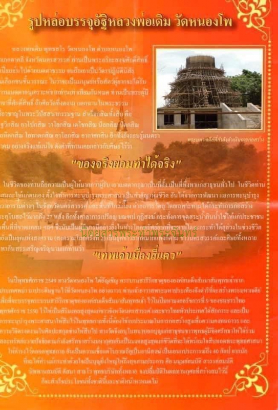 | รายละเอียดพระ | หลวงพ่อเดิม รุ่นบรรจุอัฐิ วัดหนองโพธิ์ นครสวรรค์ หลวงพ่อน้อย ได้มอบอัฐิหลวงพ่อเดิมให้ไว้จำนวนหนึ่งกับคุณลุงพี หลานหลวงพ่อเดิม และคุณมนัส ซึ่งเป็นตระกูลดั้งเดิมแห่งบ้านหนองโพได้มอบอัฐิและเส้นเกศาไว้อีกจำนวนหนึ่งและได้เก็บรักษาไว้กว่า 17 ปีมาแล้ว วันหนึ่งฉุกคิดว่า ถ้าตัวเองไม่อยู่แล้วใครจะเก็บรักษาต่อไป นานไปใครจะรู้ว่าเป็นอัฐิหลวงพ่อเดิม จึงคิดได้ว่าต้องเก็บไว้ในที่สมควรและแบ่งให้ศิษย์ที่นับถือ หรือผู้ที่เคยร่วมบุญกับท่านมาได้ไว้บูชา จึงนำความประสงค์ขึ้นกราบเรียนขออนุญาตต่อหลวงพ่อพระมหาประเทือง เจ้าอาวาสวัดหนองโพ โดยได้รับอนุญาตให้จัดสร้างได้เพียง 1,000 องค์ โดยมอบให้ผู้ร่วมสละทรัพย์ถวายปัจจัยก่อสร้างพระมหาเจดีย์ในคราวนี้เป็นจำนวนเงิน 1,999 บาท จะได้รับมอบรูปหล่อเหมือนบรรจุอัฐิหลวงพ่อเดิมหนึ่งองค์ไว้เป็นที่สักการะบูชาเพื่อเป็นมงคลแก่ตนและครอบครัวสืบไป ชนวนมงคลในการสร้าง อัฐิ เส้นเกศาหลวงพ่อเดิม กำแพงโบสถ์เก่า (โบราณถือเป็นดังกำแพงแก้วเจ็ดชั้นป้องกันสารพัดพิบัติภัย) ตะกรุดต่าง ๆ ของหลวงพ่อเดิม ท้องแหวนธงชาติ ฯลฯ ทำพิธีขอขมาอัญเชิญนำอัฐิ เส้นเกศาของหลวงพ่อมาบดผสมมวลสารมงคลบรรจุภายในรูปหล่อเหมือน ปิดทับด้วยชันโรงใต้ดิน ปิดด้วยชนวนโลหะอีกที แล้วตอกโค๊ดหมายเลข 1-1000 กำกับแล้วนำเข้าพิธีมหาเทวาพุทธาภิเษก ณ พระอุโบสถวัดหนองโพ ในวันที่ 9 กรกฏาคม 2550 กับพระเกจิอาจารย์ผู้เรืองนามแห่งยุค 16 รูปแล้วเข้าพิธีปลุกเสกเดี่ยวตลอดไตรมาสพรรษาอีกโดยหลวงพ่อประเทือง เจ้าอาวาส และท่านยังเมตตาลงจารอักขระด้วย นะพัทรกัลป์ ประทับไว้ใต้ฐานทุกองค์ สืบเนื่องจากเมื่อปี 2549 ทางวัดหนองโพได้อัญเชิญพระบรมสารีริกธาตุขององค์สมเด็นพระสัมมาสัมพุทธเจ้ามาประดิษฐานไว้ที่วัดหนองโพอย่างถาวร ทางเจ้าอาวาสจึงได้ดำริที่จะ จัดสร้างมหาเจดีย์เพื่อบรรจุพระบรมสารีริกธาตุไว้ในปีมหามงคลขององค์พระบาทสมเด็จพระเจ้าอยู่หัวรัชกาลที่ 9 เพื่อไว้เป็นสิริมงคลสูงสุดแก่ปวงชนชาวไทยทั่วประเทศ ทั้งนี้การจัดสร้างมหาเจดีย์ต้องใช้งบประมาณในการก่อสร้างสูง เพื่อให้เกิดความคงทนและความ งดงามสืบต่อไป ในการนี้ทางวัดได้จัดสร้างรูปหล่อเหมือนขึ้นเพื่อให้ศานุศิษย์ได้ร่วมบุญมหากุศลในครั้งนี้ และเพื่อเป็นการสืบทองพระพุทธศาสนา โดยถอดพิมพ์มาจากรูปหล่อเหมือนปั๊มพิมพ์ A องค์แชมป์ จัดสร้างจำนวน 1,000 องค์ โดยทุกองค์จะบรรจุอัฐิ ตอกโค๊ต ลำดับที่ และจาร พระเจ้าห้าพระองค์ที่ใต้ฐาน โดยชนวนมวลสารที่จัดสร้างนั้นประกอบด้ว