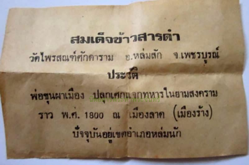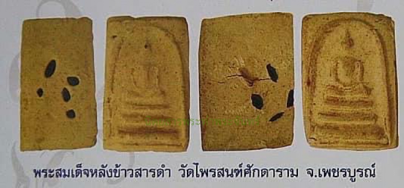 | รายละเอียดพระ | พระสมเด็จหลังยันต์น้ำเต้า วัดไพรสณฑ์ศักดาราม หล่มสัก เพชรบูรณ์ เนื้อผงมหาพุทธคุณผสมข้าวสารดำ ด้านหลังฝังเมล็ดข้าวสารดำ 5 เมล็ด ดำเนินการจัดสร้างขึ้นเมื่อปี พ.ศ.2513-พ.ศ.2515 โดยสมเด็จพระวีรญาณมุนี อดีตเจ้าคณะจังหวัดเพชรบูรณ์ เป็นประธานจัดสร้างโดยประกอบพิธีมหาพุทธาภิเษกอย่างยิ่งใหญ่ ประวัติของข้าวสารดำ เกิดขึ้นมาตั้งแต่สมัยพ่อขุนผาเมือง เจ้าเมืองราด ประวัติศาสตร์กล่าวว่า พ่อขุนผาเมือง ทำการปลุกเสกข้าวสารดำนี้ เพื่อแจกทหารในยามสงครามราว พ.ศ.1800 ณ.เมืองลาด (เมืองร้าง) ปัจจุบันอยู่ในเขตอำเภอหล่มสัก เมล็ดข้าวสารดำศักดิ์สิทธิ์ที่อยู่รอบๆพระธาตุนั้น ด้วยอำนาจแห่งพุทธคุณแล้วเมล็ดข้าวสารดำจะได้รับพลังแห่งพุทธานุภาพจากองค์พระธาตุเจดีย์ที่แผ่บารมีออกมารอบๆพระธาตุเป็นเวลาหลายพันปีจึงทำให้เมล็ดข้าวสารดำเกิดความศักดิ์สิทธิ์ไปในตัว มีเทวาอารักษ์ทำการรักษาเอาไว้ทำให้เกิดความศักดิ์สิทธิ์ได้ตามปราถนา เน้นไปในทางด้านความอุดมสมบูรณ์ โชคลาภสักการะ มีอยู่มีกินไม่ฝืดเคืองของทรัพย์สมบัติทั้งปวง พระคณาจารย์ที่ร่วมพุทธาภิเษก สมเด็จพระวีรญาณมุนีอดีตเจ้าคณะจังหวัดเพชรบูรณ์เป็นประธานจัดสร้าง หลวงพ่อทบ วัดชนแดน เพชรบูรณ์ หลวงพ่อกวย วัดโฆสิตาราม ชัยนาท หลวงพ่อพริ้ง วัดโบสถ์โก่งธนู ลพบุรี หลวงพ่อแพ วัดพิกุลทอง สิงห์บุรี หลวงปู่คำมี วัดถ้ำคูหาสวรรค์ ลพบุรี ข้อมูลภาพอ้างอิงจาก จากหนังสือมงคลทิพย์ พระเครื่องและวัตถุมงคลหลวงพ่อกวย วัดโฆสิตาราม “ เมื่อใจมีศรัทธา ปาฏิหาริย์จะเกิดขึ้นเสมอ “ |