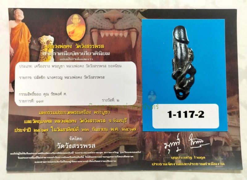 รายละเอียดพระ ปลัดขิกนางครวญ หลวงพ่อคง วัดวังสรรพรส จังหวัดจันทบุรี สภาพสวย รองแชมป์งานพื้นที่ติดรางวัลที่ 2 งานวัดวังสรรพรสปี2567 พร้อมใบประกาศ แกะจากไม้แก่นตาลขนาด 3.5 นิ้ว ศิลปะนิยมยุคต้น "ผมแกละ" จัดสร้างในยุคประมาณปี2กว่า ศิลปะการแกะของอาจารย์ถนอม โพธิ์ทอง ใช้ไม้มงคลในการจัดสร้าง ไม้แก่นตาลความเชื่อทางพุทธคุณในหลายด้าน เช่น เป็นสัญลักษณ์ของการตัดกิเลสตามคำสอนของพระพุทธเจ้า และยังมีความเชื่อว่าการมีไว้บูชาจะนำมาซึ่งความเป็นสิริมงคล และโชคลาภ และไม้แก่นตาลหายากจัดสร้างน้อย ดอกนี้ศิลปะงดงามสวยมีเสน่ห์ สรีระสวยงามสมสัดส่วน เจาะอุดกริ่งไว้ที่หัวปลัด จารกำกับขึ้นหัวปลัดตามแบบฉบับของวัดวังสรรพรส กำกับ"โอม ปิ"ด้านขวา กำกับ"โอม มิ"ด้านซ้าย ลงหัวใจโจร "กัณหะ เนหะ" สุดยอดพระคาถาที่ใช้ในทางเมตตามหานิยมและแคล้วคลาดจากอันตราย ลงพระคาถา "อุโลปะสุโล" บทย่อของคาถาที่หลวงพ่อคง ท่านใช้ปลุกเสกปลัดขิกย่อมาจากบทเต็มดังนี้ "โอมมะศิวะลึงค์ กำลังจะหึง สวาหะ อุปะสัมปะ สุนะโมโล อุโลปะสุโล เวสสะพุสะ อิสะรุทัง จะภะกะสะ นะมะพะทะ" ลงหัวใจไก่กุก "กูกุกูกู" สุดยอดทางด้านเมตตามหาเสน่ห์ เมตตามหานิยม ลงหัวใจเปรต "ทุสะนะโส" ใช้ทางด้านแคล้วคลาดและเมตตา โชคลาภ เสกหัวใจธาตุทั้ง 4 "นะมะพะทะ" ลงตัวปลัด กำกับตัว "นะ" ตัว "อุณาโลม" กำกับตัว "คงขอม" สุดยอดเครื่องรางด้านเมตตามหาเสน่ห์ เมตตามหานิยม ต้องยกให้ปลัดขิกนางครวญ ดอกนี้รองแชมป์งานวัดวังสรรพรส งานใหญ่พื้นที่ การันตีคุณภาพ ความสวย แท้ดูง่ายสบายตา วิธีบูชาปลัดขิกนาง หลวงพ่อคง สุวัณโณ ตั้ง "นะโม 3 จบ" แล้วว่า "พุทธังรัตนานัง ธัมมังรัตนานัง สังฆังรัตนานัง ลูกขออาราธนาหลวงพ่อคง วัดวังสรรพรส จันทบุรี ขอบารมีจากหลวงพ่อ ให้ลูกมีเมตตามหาเสน่ห์ เมตตามหานิยม อุดมด้วยโชคลาภ แคล้วคลาด คงกะพันชาตรี ถ้าค้าขายให้ขายดีดังเทน้ำเทท่า โอม พระศิวลึง กำลังจะหึง สวาหะ จงบังเกิดมีกับตัวลูก สาธุ" 南庫護身符,位於尖竹汶府旺薩帕羅斯寺的龍波公(Luang Pho Kong),保存完好,在當地比賽中獲得亞軍,在 2024 年 Wat Wangsanpharot 寺廟集市上獲得第二名,並獲得證書。採用3.5英寸(約8.8厘米)長的棕櫚木雕刻而成,是早期流行的“分發”藝術,創作於2000年左右。阿贊·塔儂·波通(Ajarn Thanom Phothong)的雕刻藝術選用吉祥木材。棕櫚木被認為具有許多佛教功德。例如,根據佛陀的教誨,它是斷除煩惱的象徵。人們也相信供奉它會帶來好運和好運。這種珍貴的棕櫚木產量很少。這朵花藝術感十足,魅力十足。花體比例勻稱。護身符的頭部鑽有一口鈴鐺。護身符上的銘文遵循了旺薩帕羅斯寺(Wat Wang Sapparos)的風格。護身符右側刻有「嗡毗」(Om Pi),左側刻有「嗡彌」(Om Mi)。盜賊的心臟位置刻有「坎哈涅哈」(Kanha Neha),這是祈求慈悲和逃離危險的終極咒語。護身符上還刻有「烏洛帕蘇洛」(Ulopasulo),這是龍婆空所寫的護身符縮寫版本。他用縮寫的林伽,在“Kukukuku”雞心上,以最有魅力和人緣的名義,用完整的偈語“Omma Shiva Lingam,我會嫉妒的,Svaha,Upasampa,Sunamolo,Ulupasulo,Vessapusa,Isarutang,Chabhakasa,Nama Tha”來供奉完整的偈語。在「Thusanaso」鬼魂的心臟上,他用縮寫的林伽,來供奉完整的偈語「Omma Shiva Lingam,我會嫉妒的,Svaha,Upasamp