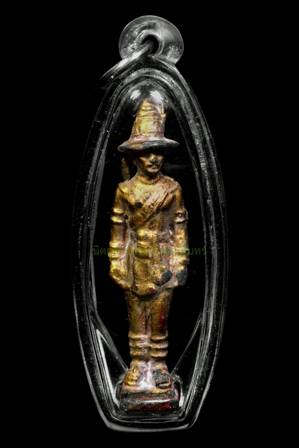 A standing statue of King Taksin, Taksin Camp, Chanthaburi Province, 2531 BE (1988 AD). Made of lead with vermilion coating and gold leaf. The statue is encased in a clear, waterproof frame, ready for worship. The original surface is beautiful and shows signs of age. A code is stamped on the base. The casting is complete and undamaged The history of the creation of the sacred amulets: the replica cast statue of King Taksin the Great and the King Taksin banner amulet, 1988. They were created at Taksin Camp, Chanthaburi, by Captain Phisai Panjai (his rank at the time). This is another series of replica cast statues that underwent a very auspicious consecration ceremony Various revered monks from all regions of Thailand contributed gold plates inscribed with sacred characters and symbols, numbering no less than 70, to the ceremony. Many other renowned monks also participated in the consecration ceremony at Taksin Camp on Saturday, October 29, 1988 Many more, some of whom are listed below: