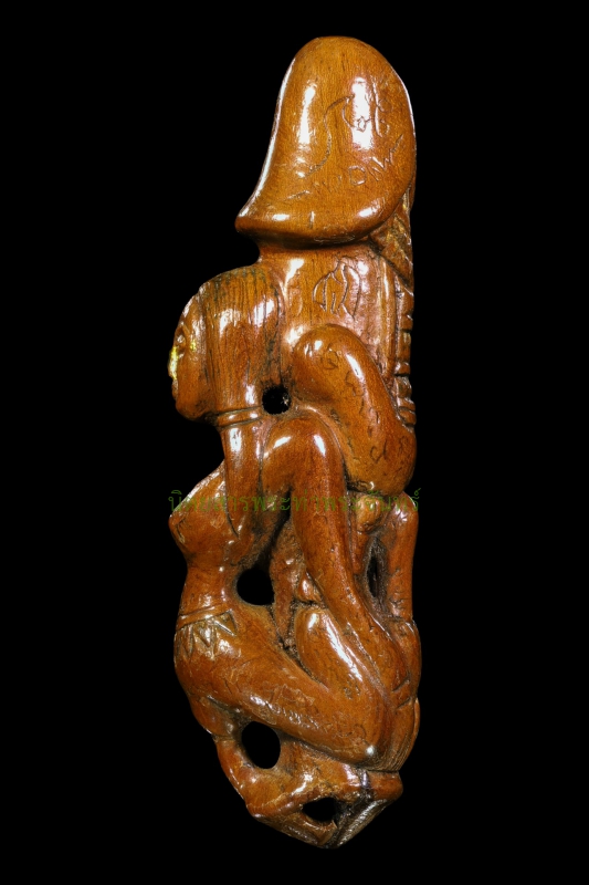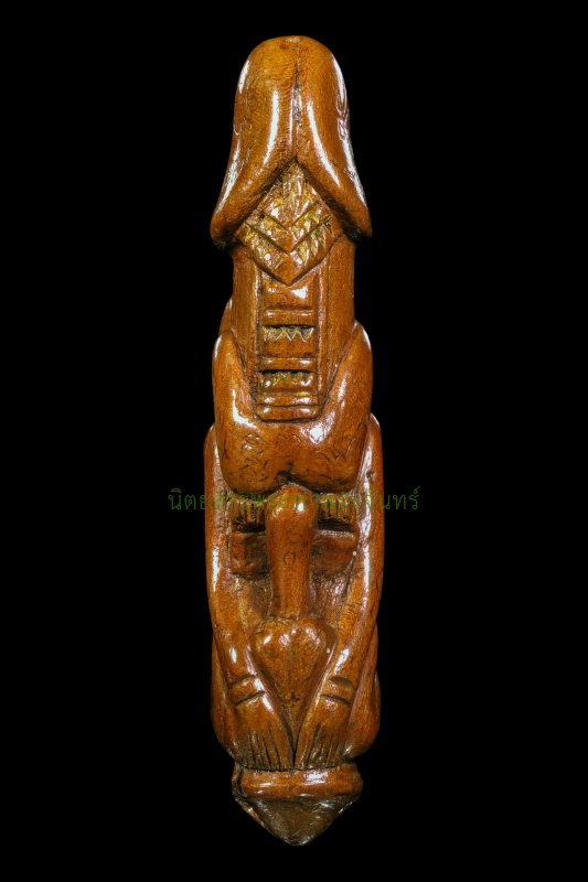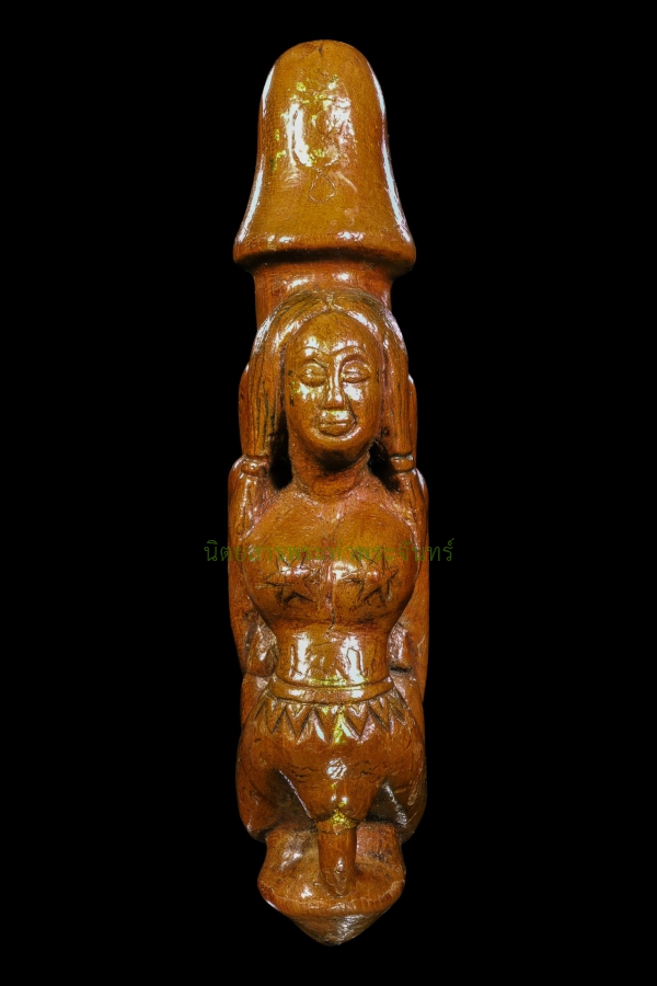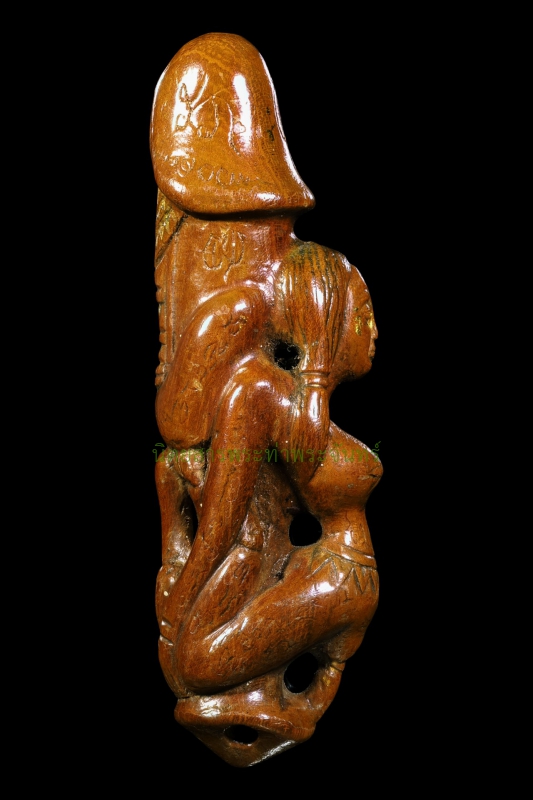 This is a beautiful Phra Khik (amulet) in the shape of a weeping woman, from Luang Pho Kong, Wat Wangsanphrarot, Chanthaburi Province. It's carved from a dead Mayom (a type of myrtle) wood, measuring 3.5 inches. It has an old finish with gold leafing, making it very charming. This piece is exceptionally beautifully carved. The wood used is a rare and powerful auspicious wood, known for its potent magical properties. The carving is by Ajarn Thanom Phothong, who used dead Mayom wood, a highly prized and rare material This amulet possesses inherent Buddhist virtues, particularly in attracting love and popularity, and is excellent for business, drawing in customers continuously. It also brings good fortune in trade and negotiations, and is highly effective in gaining favor from those who see it. When carved into an amulet, its power is further amplified. This particular piece is uniquely artistic, beautiful, charming, and gracefully proportioned This amulet is inscribed with the traditional style of Wat Wangsanphrarot, a double dose of powerful inscriptions. It includes the mantra "Om Na Hua Jai Satrei" (Heart of a Woman), a powerful blessing for female support; the mantra "Phra Hua Jai Phra Siwali" (Heart of Phra Siwali), a powerful blessing for wealth and continuous flow of money; and the mantra "Hua Jai Phra Tripitaka" (Heart of the Tripitaka), offering protection, good fortune, safety, prosperity, and peace of mind Inscribed with "Na Ramphung," the ultimate love charm; inscribed with "Yantra Na" and "Yantra Unalome," possessing universal Buddhist power; the ultimate amulet for loving-kindness, charm, and popularity is the Palad Khik Nang Kruan by Luang Pho Kong, Wat Wangsanphrarot.
