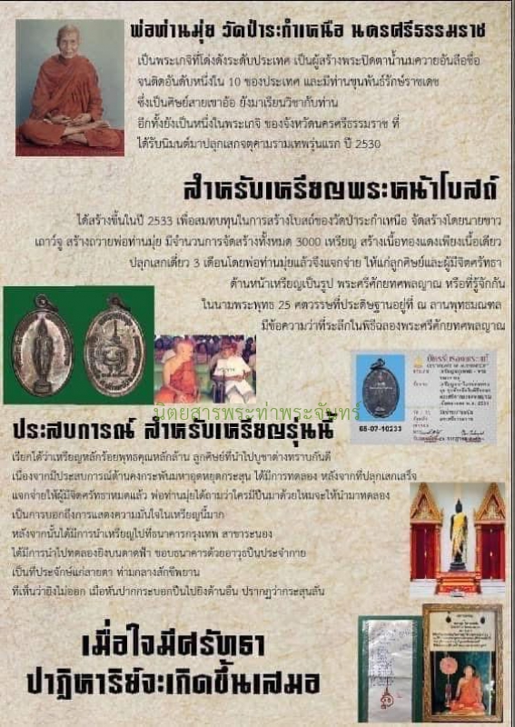 | รายละเอียดพระ | #เหรียญหน้าโบสถ์พ่อท่านมุ่ย (บล็อคนิยม) วัดป่าระกำเหนือ นครศรีธรรมราช บทความจากทั้ง 3 ท่าน บทความจากคุณสุคะโต ท่าพระจันทร์ วัตถุมงคลที่ท่านเสกจริงๆ ท่านเสกเป็นเดือนเป็นไตรมาส ไม่ครบตามที่ท่านเสก ท่านว่าใช้ไม่ได้ ที่ของอื่นให้ท่านพนมมือ ให้จับลังจับกล่อง แล้วถ่ายรูปไปลงสื่อ ต้องคิดเอาเอง ขนาด ตอนสร้างเหรียญหน้าโบสถ์ เพื่อหาเงินมาหล่อพระประธานปางลีลา ที่จะประดิษฐานไว้หน้าโบสถ์ ท่านยังพูดว่า " เขาจะหาว่ากูสร้างพระหากิน " ต้องพูดอธิบายอยู่หลายครั้งจนท่านยอม เพราะวัดไม่มีเงินจะสร้างได้ ท่านยังพูดกำชับอีกว่า " มึงอย่าสร้างมากนักแรง " "จะให้ทำบุญเท่าไหร่ " ท่านกลัวชาวบ้าน ยากจน คนแถววัด ชาวนา ชาวสวน จะไม่มีโอกาสร่วมบุญ สุดท้าย ใครทำบุญ 10 บาท จะได้รับ 1 เหรียญ เรื่องราวก็ผ่านมา 30 ปีแล้ว จำได้บ้างไม่ได้บ้างอาจคลาดเคลื่อนบ้าง แต่สาระสำคัญนั้นถูกต้องแน่นอน เพราะผู้สร้างเล่าให้ฟังมา นับครั้งไม่ถ้วน อีกทั้งทันพ่อท่าน ได้ไปกราบ ไปช่วยถ่ายรูปให้ท่าน หลายคราว ยังจำได้ ครั้งแรกที่พยุงท่านลงจากชานพักในกุฏิ ที่ท่านนั่งรับแขกเป็นประจำ ทีแรกเห็นท่านผอมมาก คิดว่าตัวท่านคงเบา เลยไม่ทันออกแรง ปรากฏว่าตัวท่านหนักกว่าที่คิด ท่านรู้สึกไม่มั่นคง ท่านเลยพูดว่า " มึงจับชับชับ" เป็นอันเข้าใจ พยุงท่านไปนั่ง จัดฉาก แล้วถ่ายรูป เสร็จก็ฟังท่านสนทนากับ ผู้ใหญ่และกับผู้คนที่มากราบท่าน โดยปกติ ท่านไม่รับนิมนต์ ไปนอกวัด ผู้ใหญ่ท่านเลยถามว่าเหตุใดพ่อท่านไม่ค่อยรับนิมนต์ไปนอกวัด ท่านตอบว่า " คนเขามาหากู ไม่เจอ เขาเสียเวลาเสียศรัทธา " ท่านเป็นพระที่ละเอียดถี่ถ้วน วาระจิตว่องไว สมถะ เรียบร้อย จะพูดจะจามีสติตลอดเวลา ไม่พูดจาเรื่อยเปื่อย ไม่ว่าใคร ที่เคยได้รับรู้มา ก็มีแค่ ท่านถามว่า " ทำไมทำอย่างนั้น " แล้วท่านก็ไม่พูดอะไรอีก ทั้งที่ผู้นั้นแอบอ้างเอาท่านไปหากิน โดยมากท่านก็เฉยเสีย กับเรื่องไม่ดี ทุกข์ร้อนมาท่านก็ช่วยตามความรู้ ไม่รู้ท่านก็บอกไม่รู้ ไม่แน่ใจท่านก็เฉยเสีย พระอย่างท่านศีลดี ศีลครบแน่นอน กราบได้สบายใจ หาแบบท่านไม่ใช่ง่ายแล้ว บทความจากพระมหาศิริเทพ เทพศิรินทร์ พ่อท่านปลุกเสกนานมากๆ พ่อท่านให้สร้างพระไว้หน้าโบสถ์ ว่าแม้โบสถ์ปิดชาวบ้านก็ได้กราบไหว้ได้ตลอด ในกาลนั้นได้ทำเหรียญวาระเพื่อฉลองพระหน้าโบสถ์ เหรียญจะเสร็จก่อน พ่อท่านนำไปเสกในกุฏิห้องที่จำวัด เวลาผ่านไป โยมพ่อขาวไปกราบท่าน ก็ถามว่าเสกเหรียญเสร็จหรือยัง พ่อท่านมุ่ยบอกว่ายับกราบเสร็จก็กลับระนอง ... ต่อมา ก็ไปกราบท่านอีก ท่