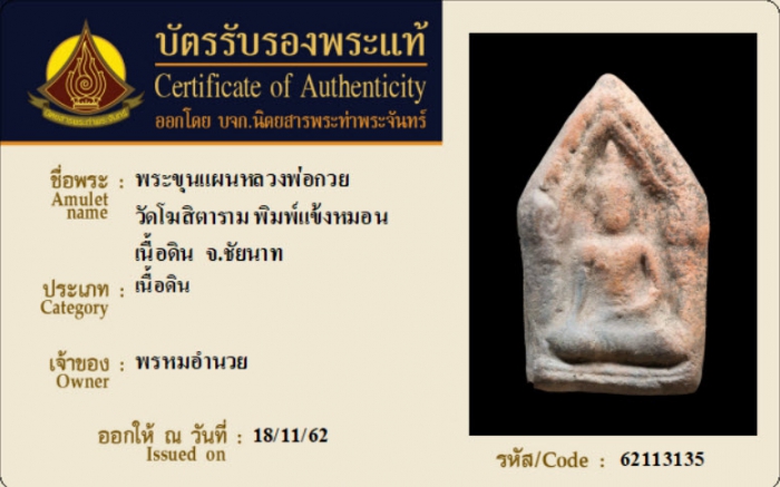 หมายเลขใบการันตี 62113135 ชื่อพระ พระขุนแผน หลวงพ่อกวย วัดโฆสิตาราม พิมพ์แข้งหมอน เนื้อดิน จ.ชัยนาท เจ้าของ พรหมอำนวย หมวดหมู่ พระเนื้อผง / ดิน / ว่าน
