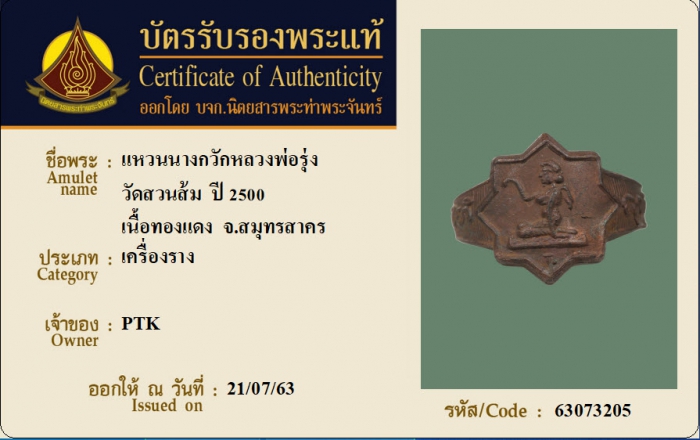 หมายเลขใบการันตี 63073205 ชื่อพระ แหวนนางกวักหลวงพ่อรุ่ง วัดท่ากระบือ ปี 2500 เนื้อทองแดง จ.สมุทรสาคร เจ้าของ PTK หมวดหมู่ เครื่องราง