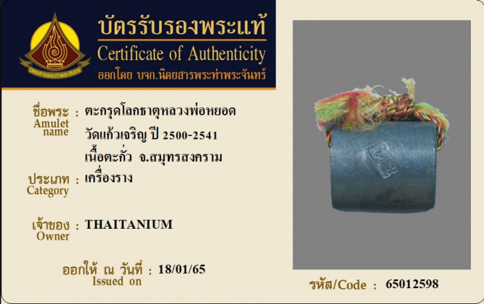 หมายเลขใบการันตี 65012598 ชื่อพระ ตะกรุดโลกธาตุหลวงพ่อหยอด วัดแก้วเจริญ ปี 2500-2541 เนื้อตะกั่ว จ.สมุทรสงคราม เจ้าของ THAITANIUM หมวดหมู่ เครื่องราง