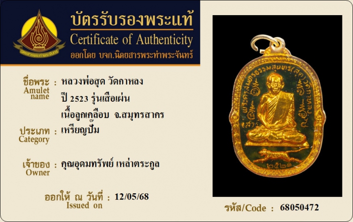 หมายเลขใบการันตี 68050472 ชื่อพระ หลวงพ่อสุด วัดกาหลง ปี 2523 รุ่นเสือเผ่น เนื้อลูกเคลือบ จ.สมุทรสาคร เจ้าของ คุณ อุดมทรัพย์ เหล่าตระกูล หมวดหมู่ เหรียญหล่อ / ปั้ม